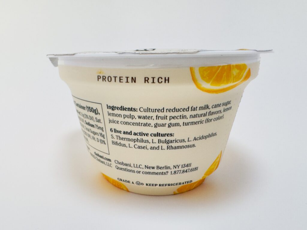 - Ingredients: Cultured reduced fat milk, cane sugar, lemon pulp, water, fruit pectin, natural flavors, lemon juice concentrate, guar gum, and turmeric (for color).