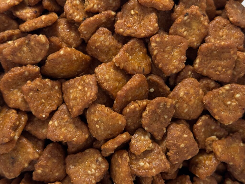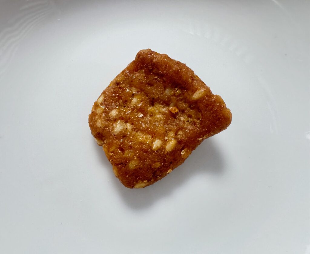 The texture is a satisfyingly dense, crunchy chip, not thin and fragile. What truly elevates them is the taste: a rich, nutty flavor from the sesame seeds and bulgur wheat is beautifully coated in a subtle, golden honey sweetness. They are truly irresistible on their own—a perfect handful for a mid-afternoon pick-me-up.