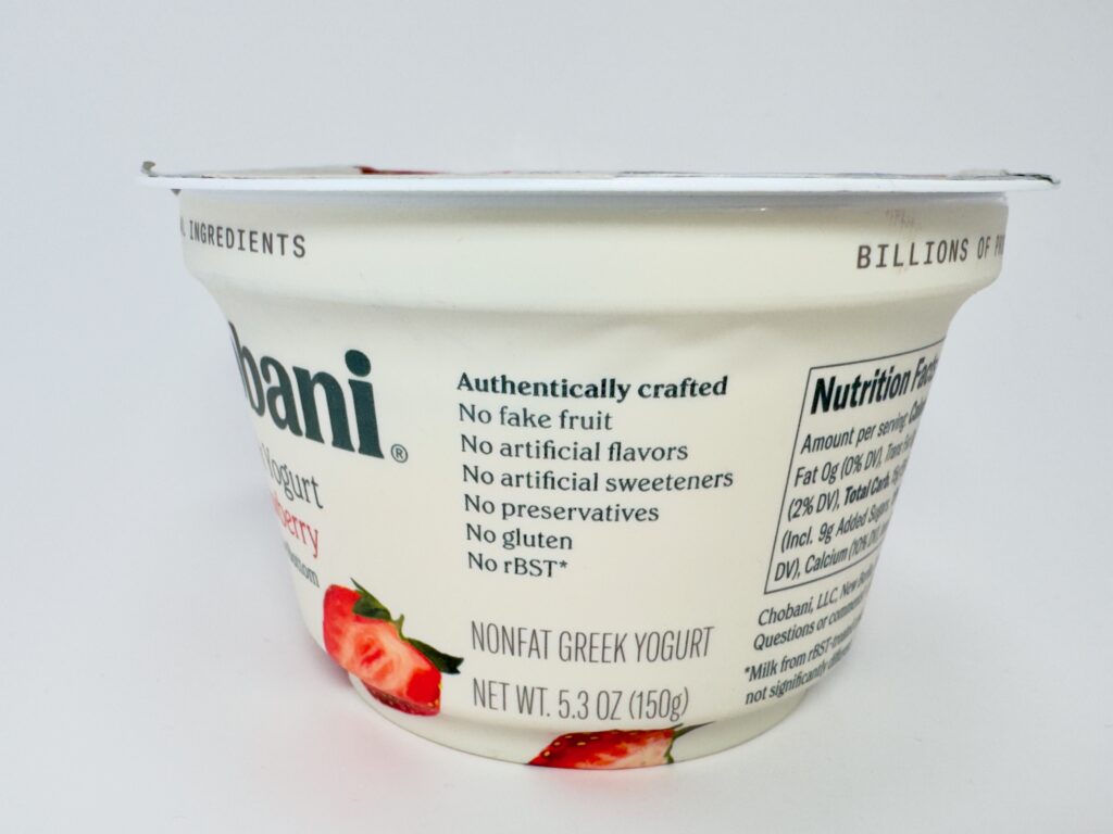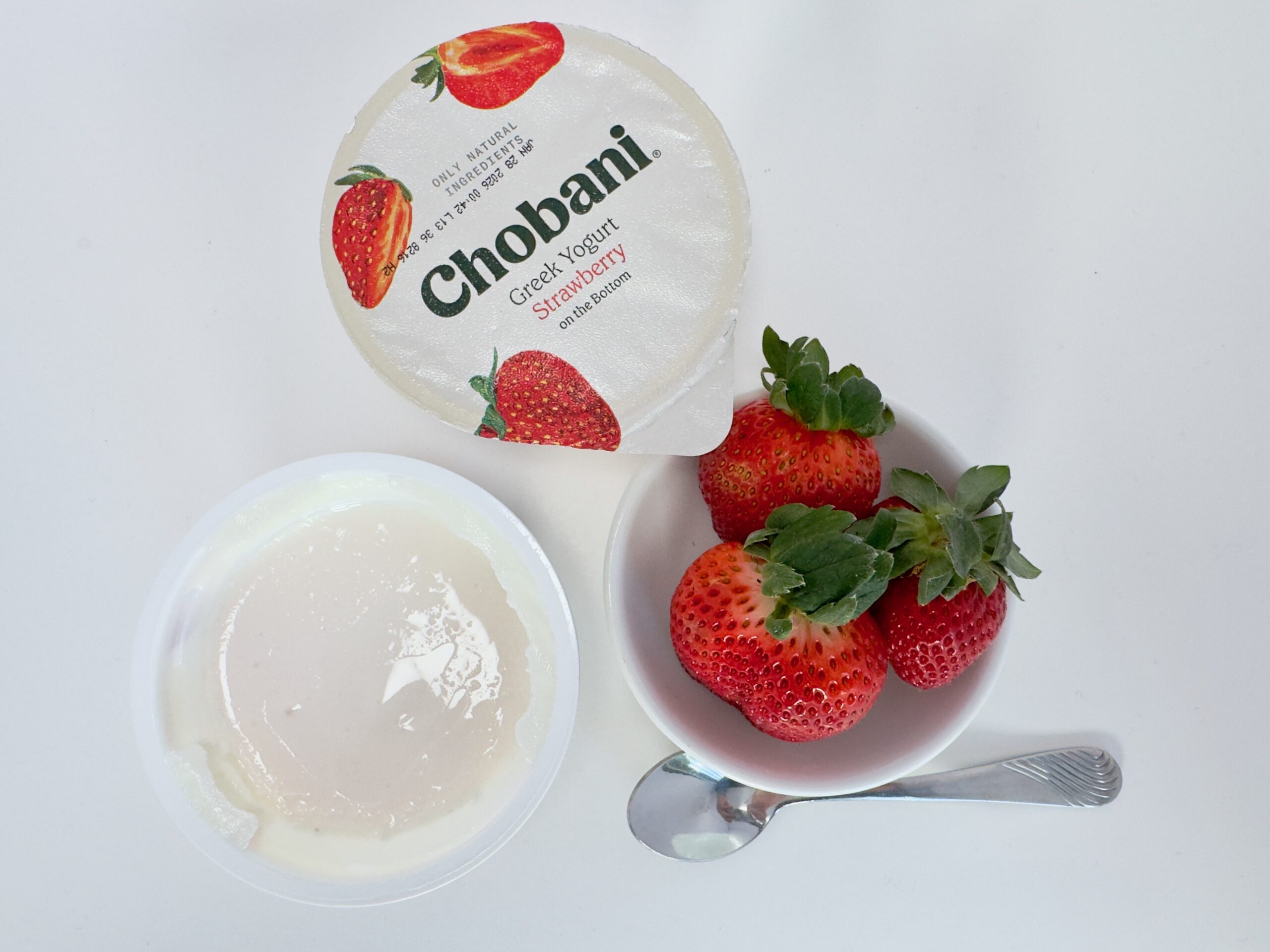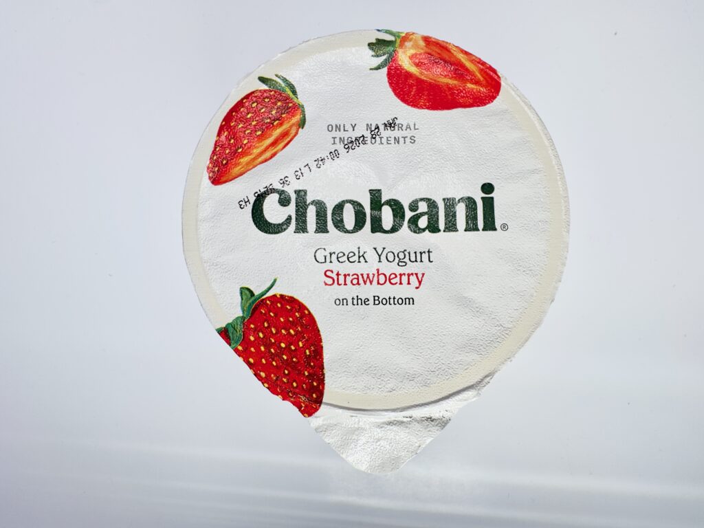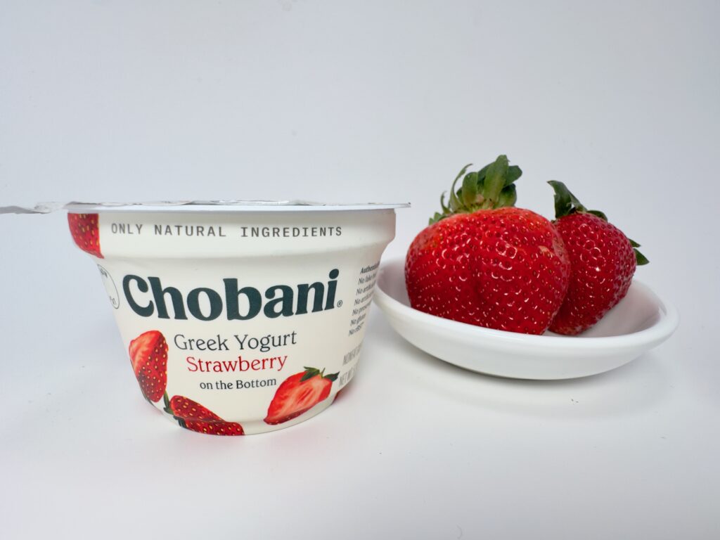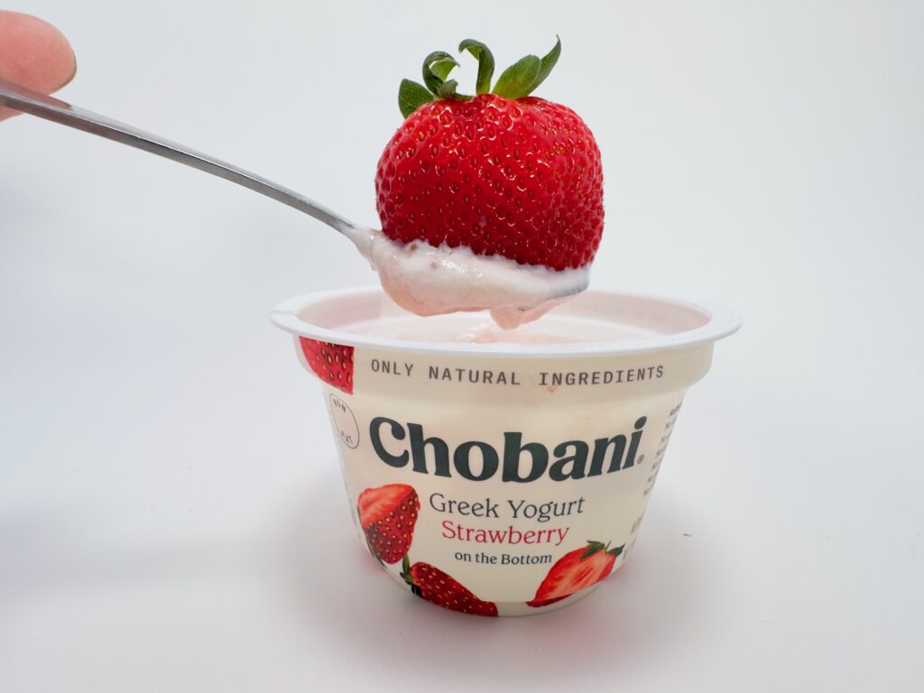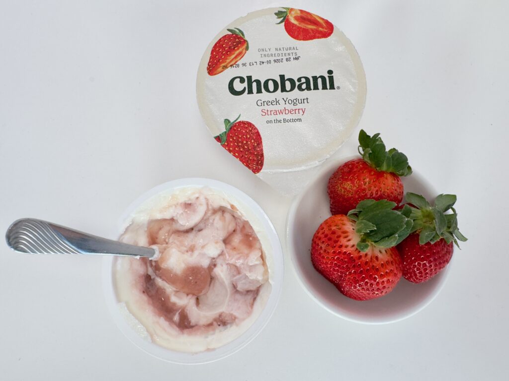 This flavor is so dominant that it has its own empire. You can find it in standard 5.3 oz cups, 4-packs, low-sugar, AND no-sugar-added versions. During my latest shoot, I managed to catch a sale where the fresh strawberries were $0.99 and the Chobani cups were also $0.99. It’s the perfect budget-friendly, high-protein snack.