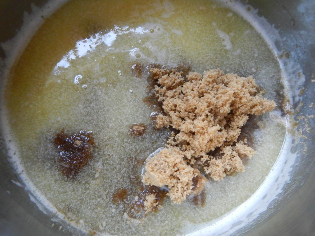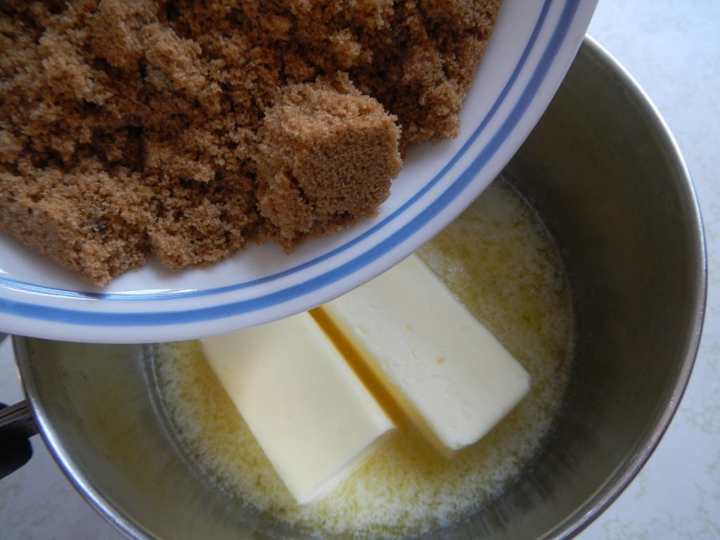 - Melt the butter and brown sugar together.