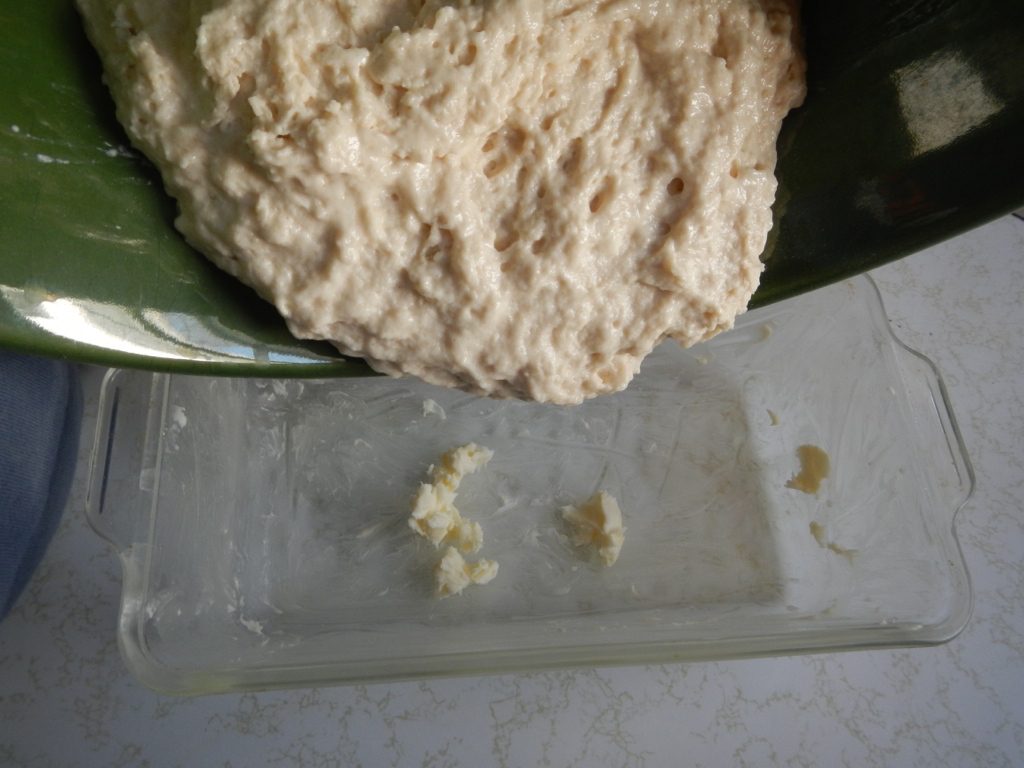 Pour dough into prepared loaf pan.