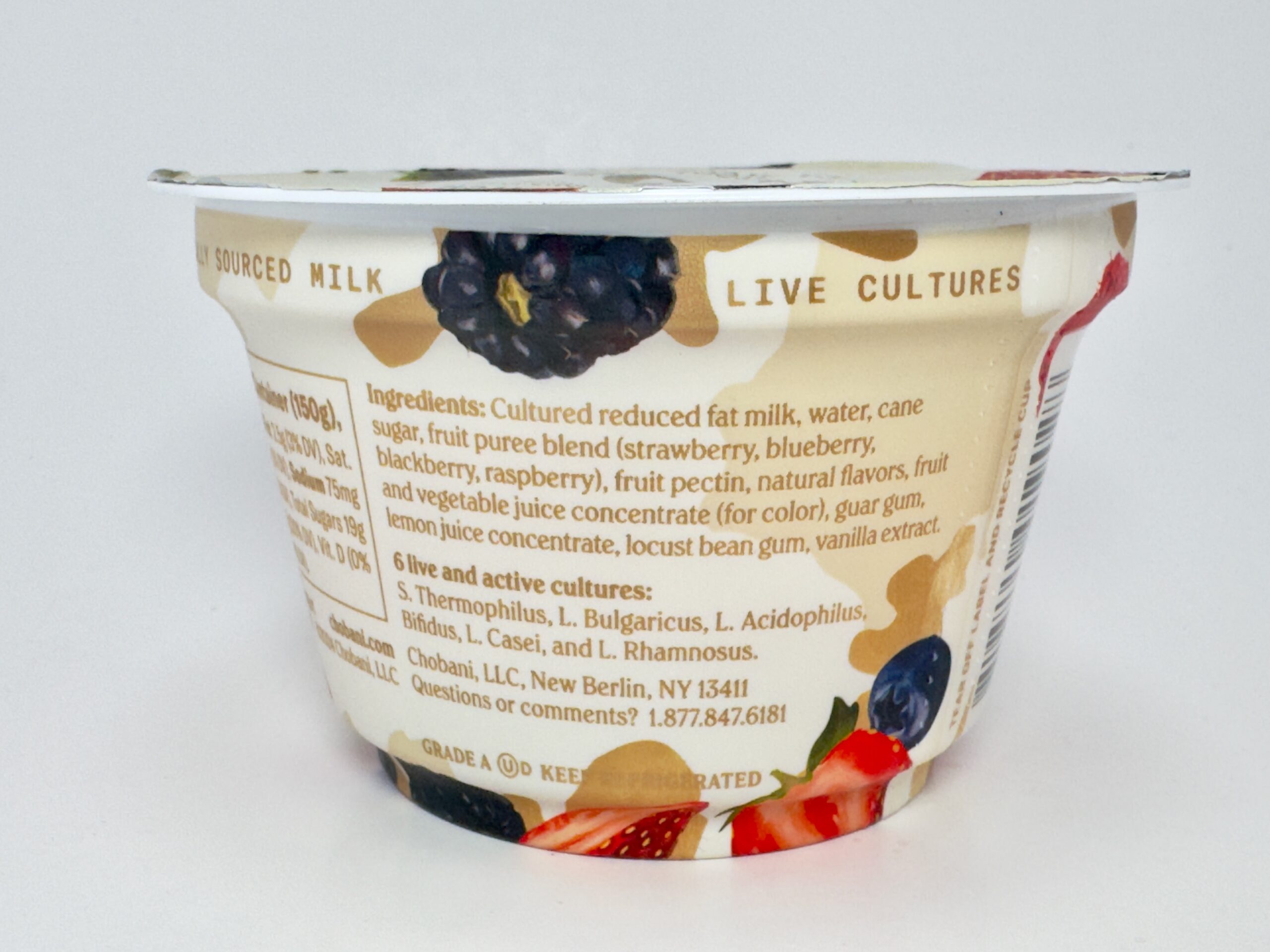 Ingredients: Cultured reduced fat milk, water, cane sugar, fruit puree blend (strawberry, blueberry, blackberry, raspberry), fruit pectin, natural flavors, fruit and vegetable juice concentrate (for color), guar gum, lemon juice concentrate, locust bean gum, vanilla extract.