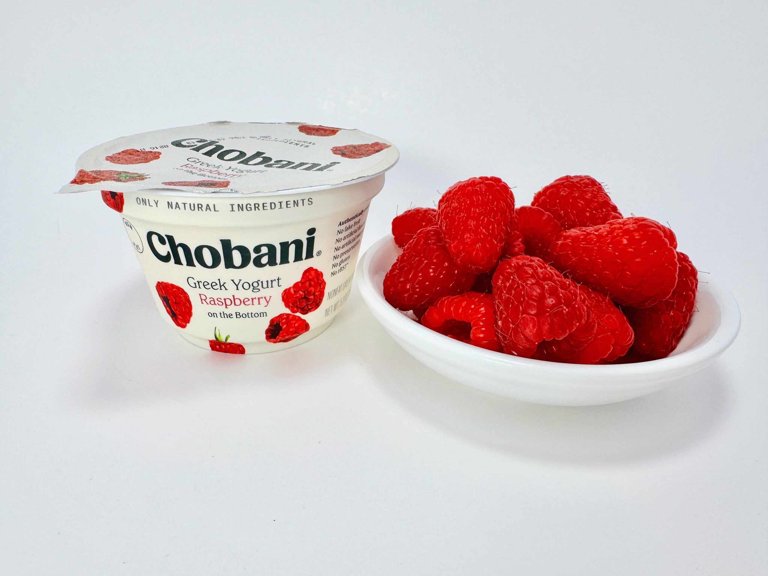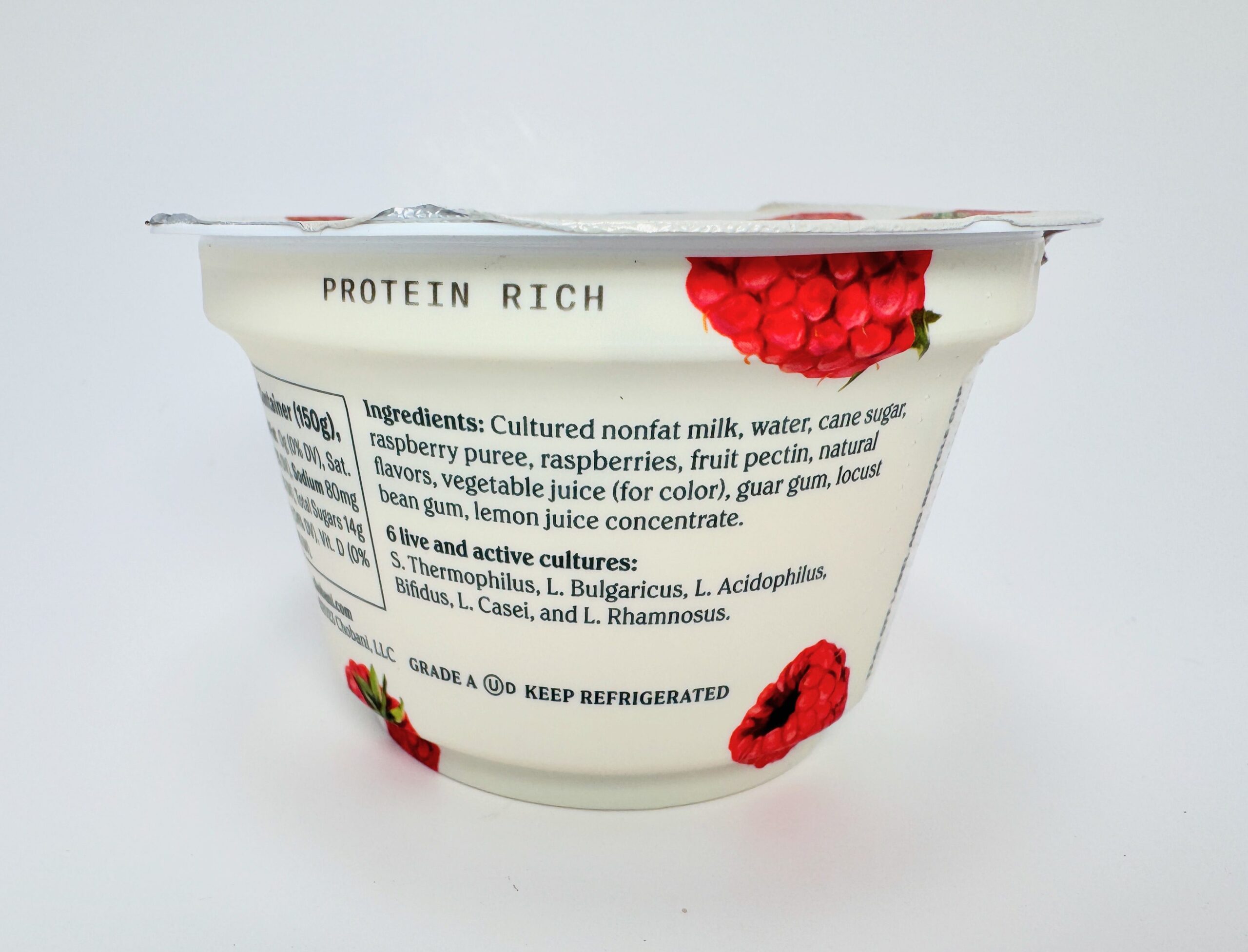 Ingredients: Cultured nonfat milk, water, cane sugar, raspberry puree, raspberries, fruit pectin, natural flavors, vegetable juice (for color), guar gum, locust bean gum, lemon juice concentrate.